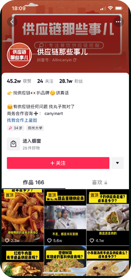 负责运营的抖音账号“供应链那些事儿”,6个月账号粉丝量达到27.9W,收获了45W赞,单个视频播放量超过500W。通过一个视频可向商家提供上百条线索,单个视频带货量可超过上千单,后台日咨询量不低于百条。通过供应链那些事儿的账号,可为供应链商家增加品牌曝光和销量,同时向餐饮行业的粉丝提供优质餐饮供应链的信息,覆盖了整个餐饮行业。
